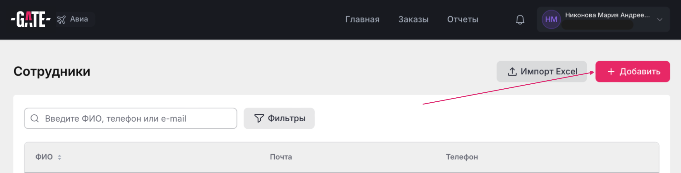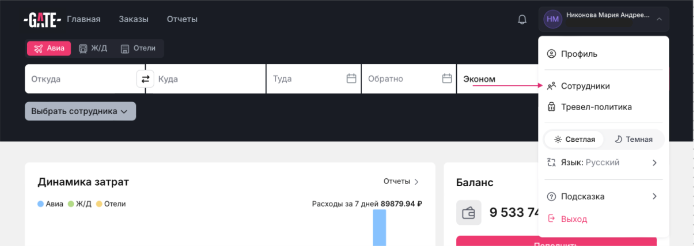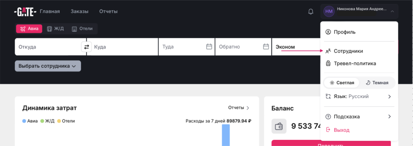 Раздел "Сотрудники" есть у пользователей с ролью Администратор или Тревел-менеджер. В нем хранится список всех сотрудников компании.