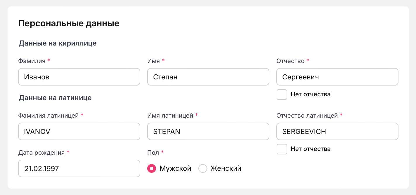 Введите ФИО на кириллице, как в паспорте РФ или в свидетельстве о рождении. Система автоматически транслитерирует его на латиницу.
