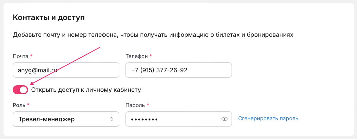 В своем профиле изменить роль или доступ не получится. Для изменения этих параметров обратитесь к другому сотруднику с ролью Администратор или Тревел-менеджер.