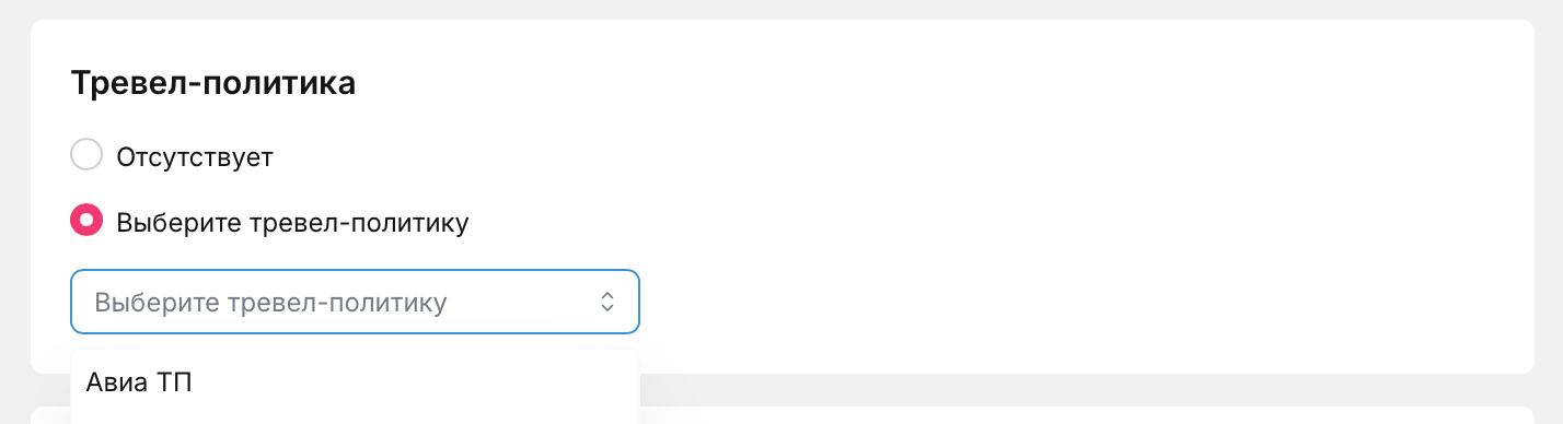 Для назначения тревел-политики переместите указатель в поле «Выбрать тревел-политику» и выберите подходящую из выпадающего списка.