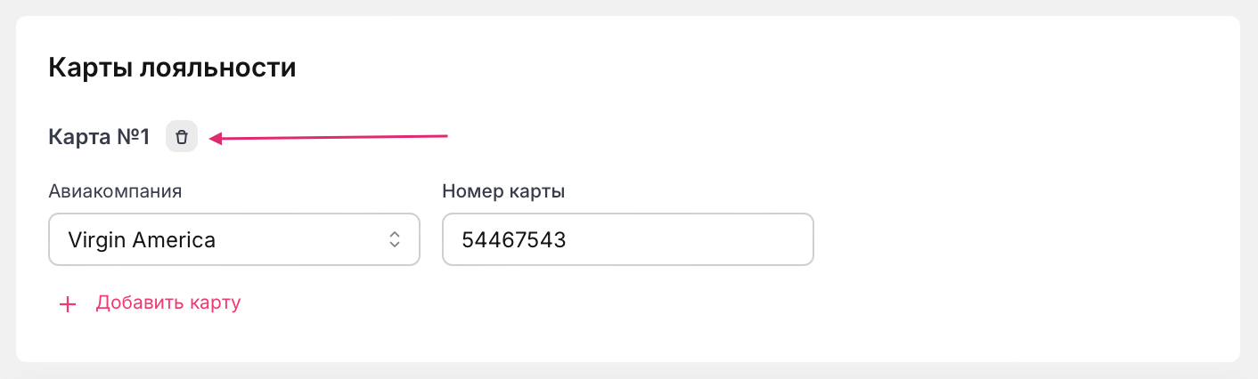 Важно! У сотрудника с любой ролью есть доступ к добавлению/удалению карт лояльности в своем профиле. Корректировать карты лояльности других сотрудников может только Администратор или Тревел-менеджер.
