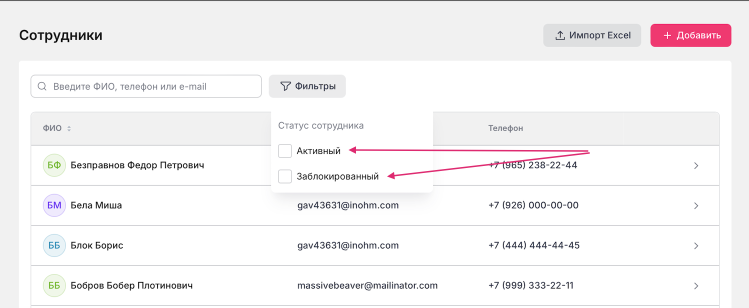 Его можно отфильтровать по статусу сотрудника.