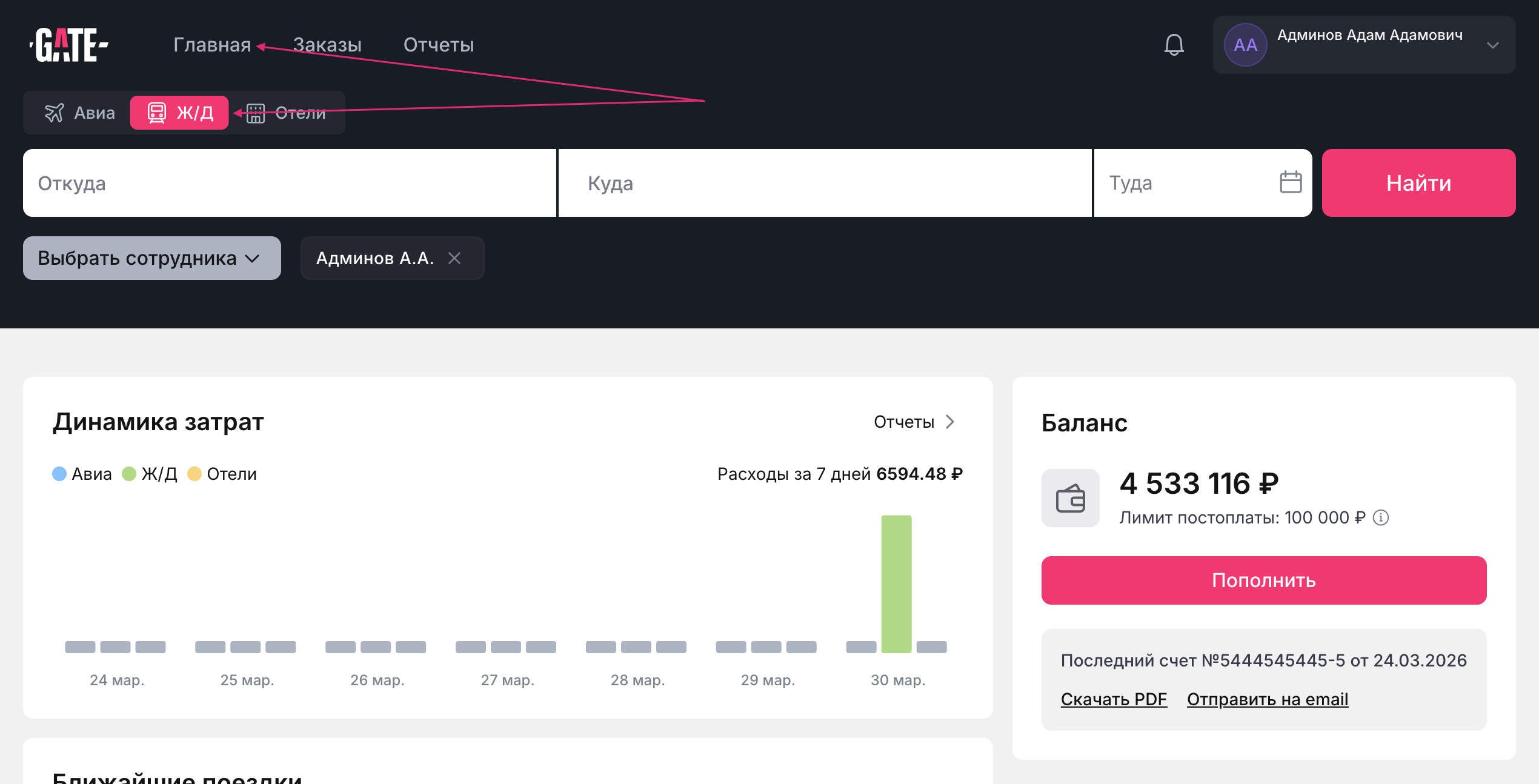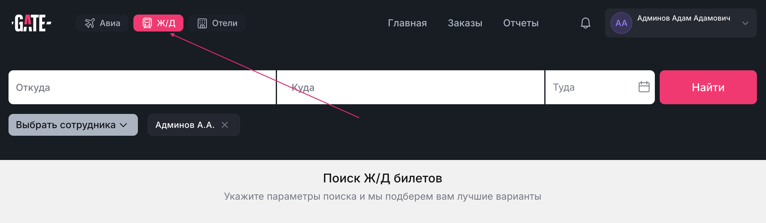 Покупка ж/д билетов доступна не для всех ролей, поэтому если вы не видите в своем личном кабинете поисковый виджет, обратитесь к администратору вашей компании.