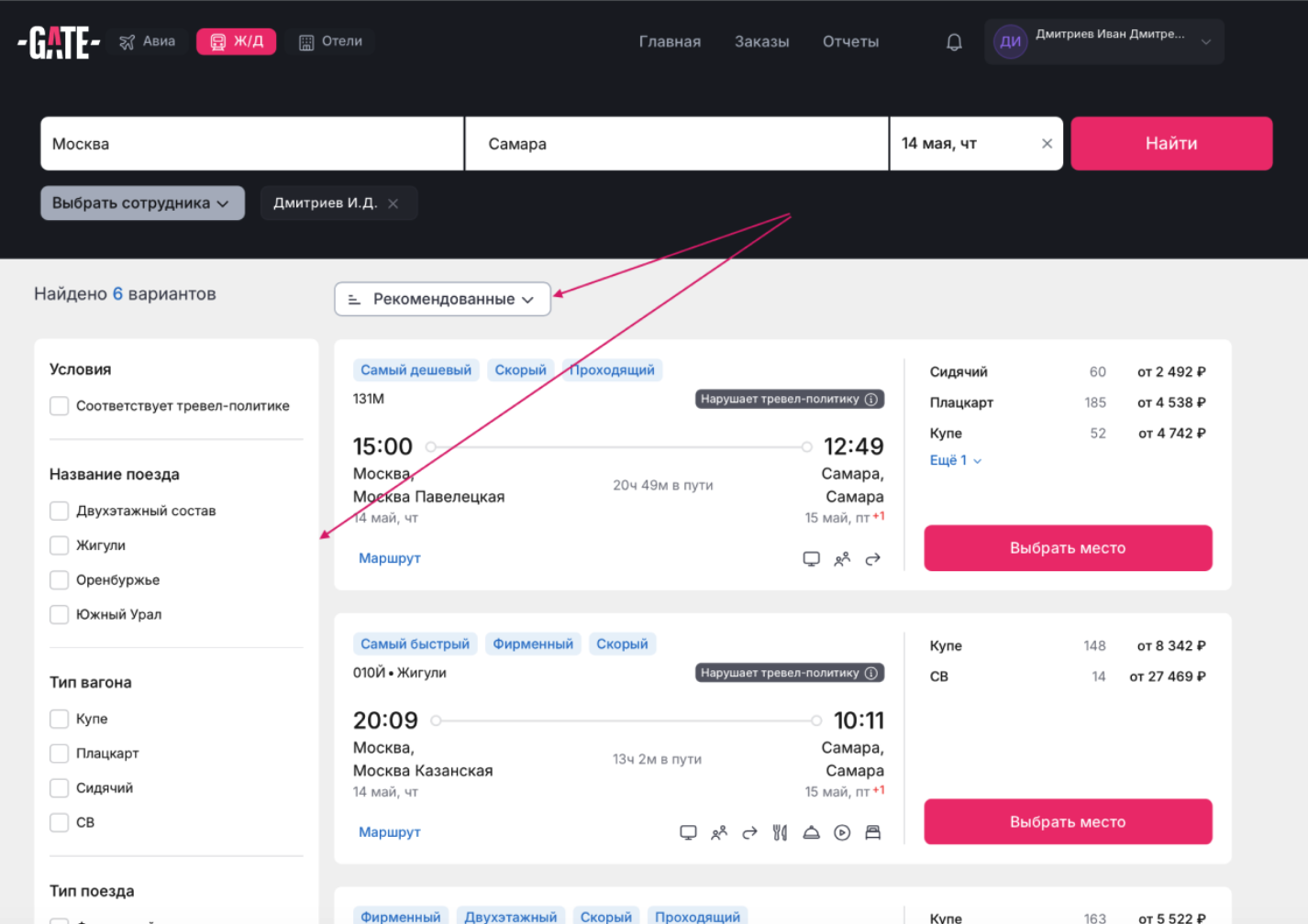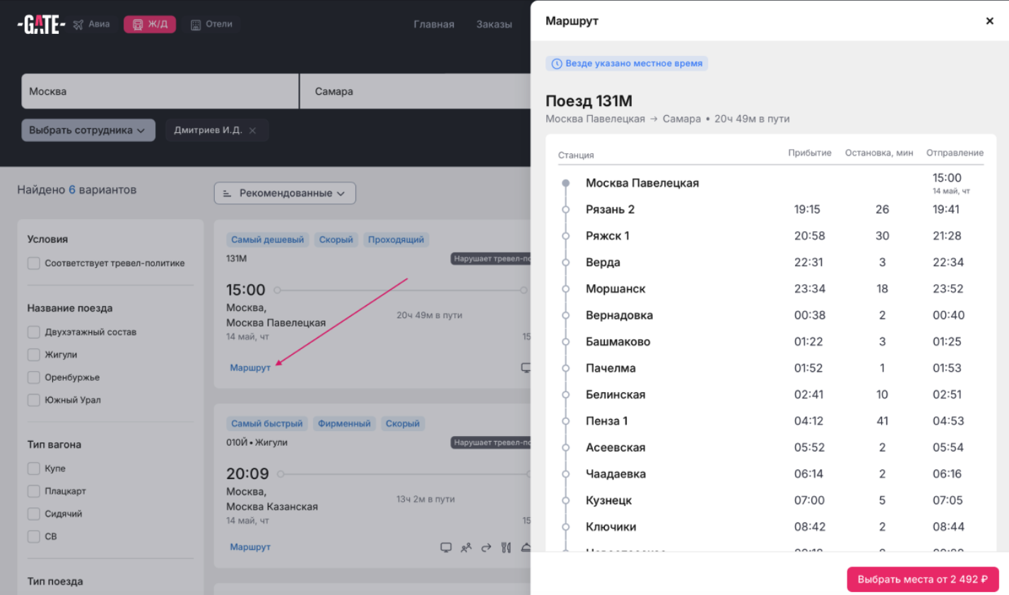 2. Выбор подходящего поезда