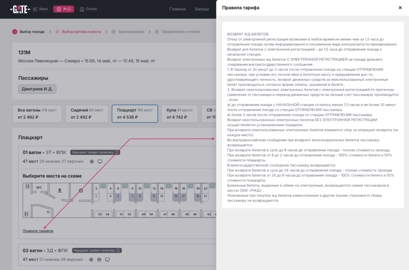 Там же можно ознакомиться с правилами тарифа по каждому типу вагона.