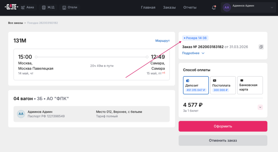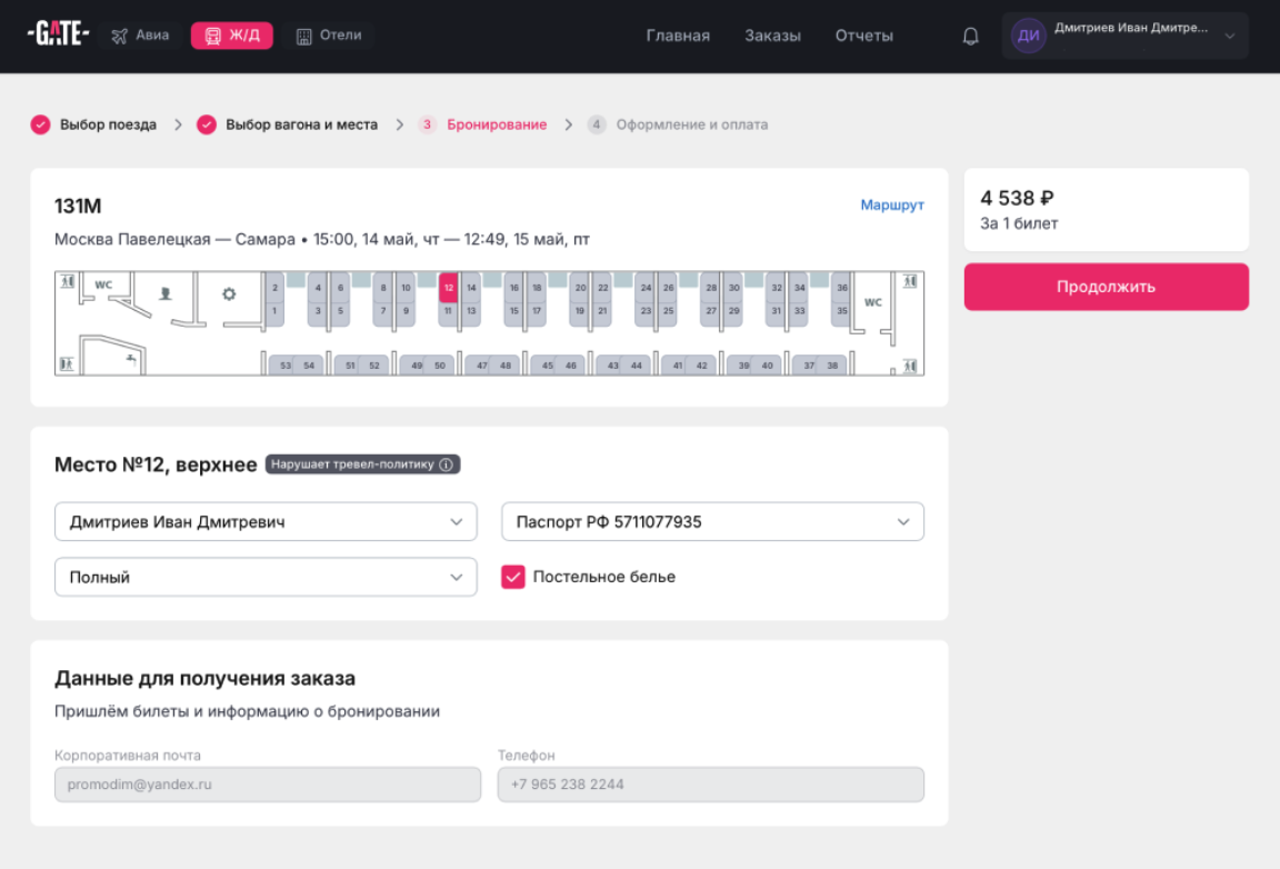 На странице создания брони проверьте документы пассажира и нажмите "Продолжить".