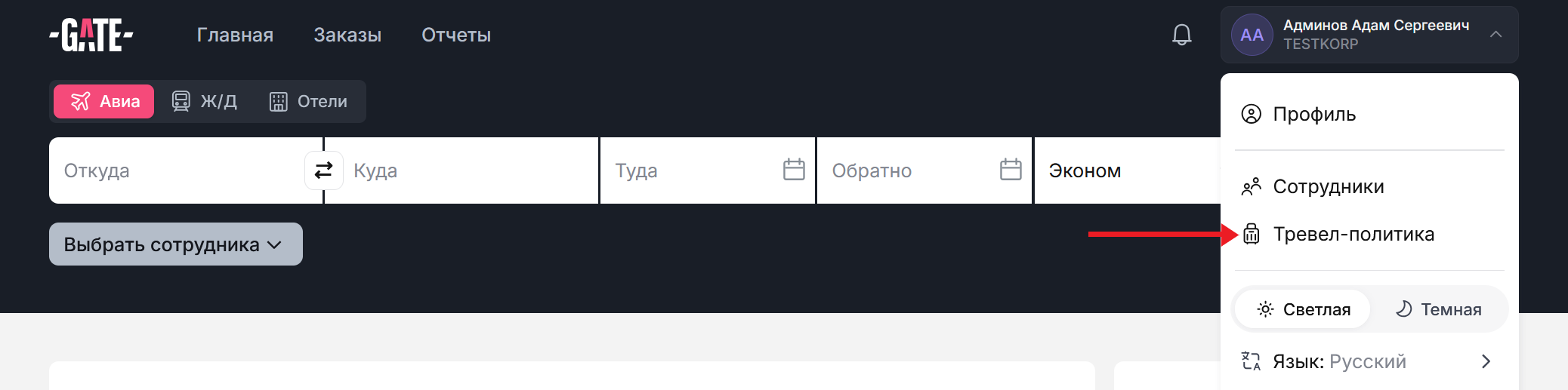 Для создания тревел-политики раскройте меню в правом углу страницы