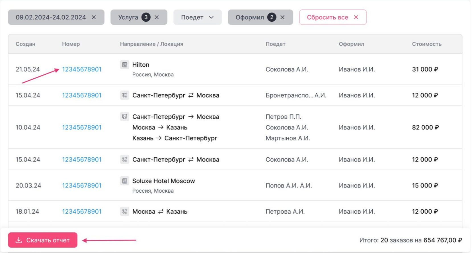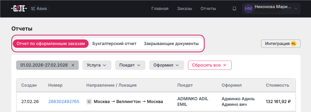 Администратор и Бухгалтер имею доступ ко всем отчетам в этом разделе. Тревел-менеджер только к отчету по оформленным заказам.