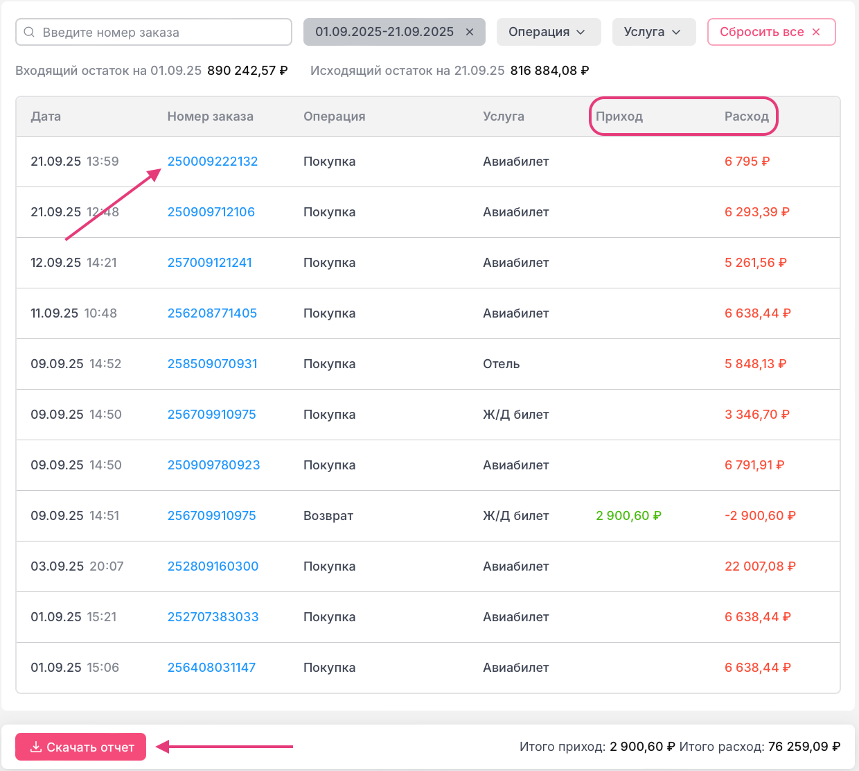 В данном отчете отображаются все операции с указанием суммы прихода и расхода.