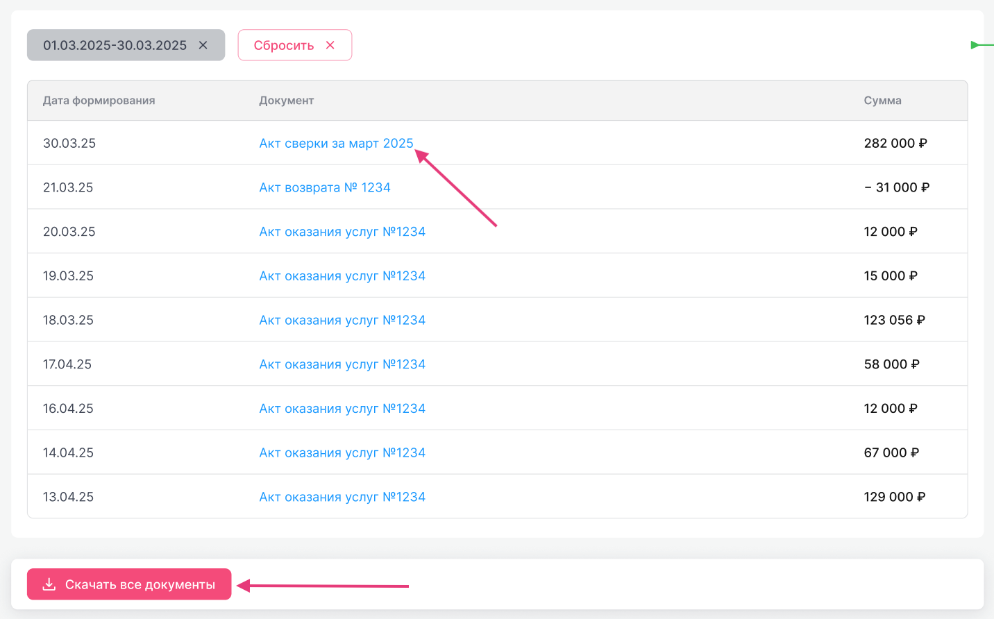 Документы можно выгрузить также одним Excel файлом. Воспользуйтесь для этого кнопкой «Скачать все документы».