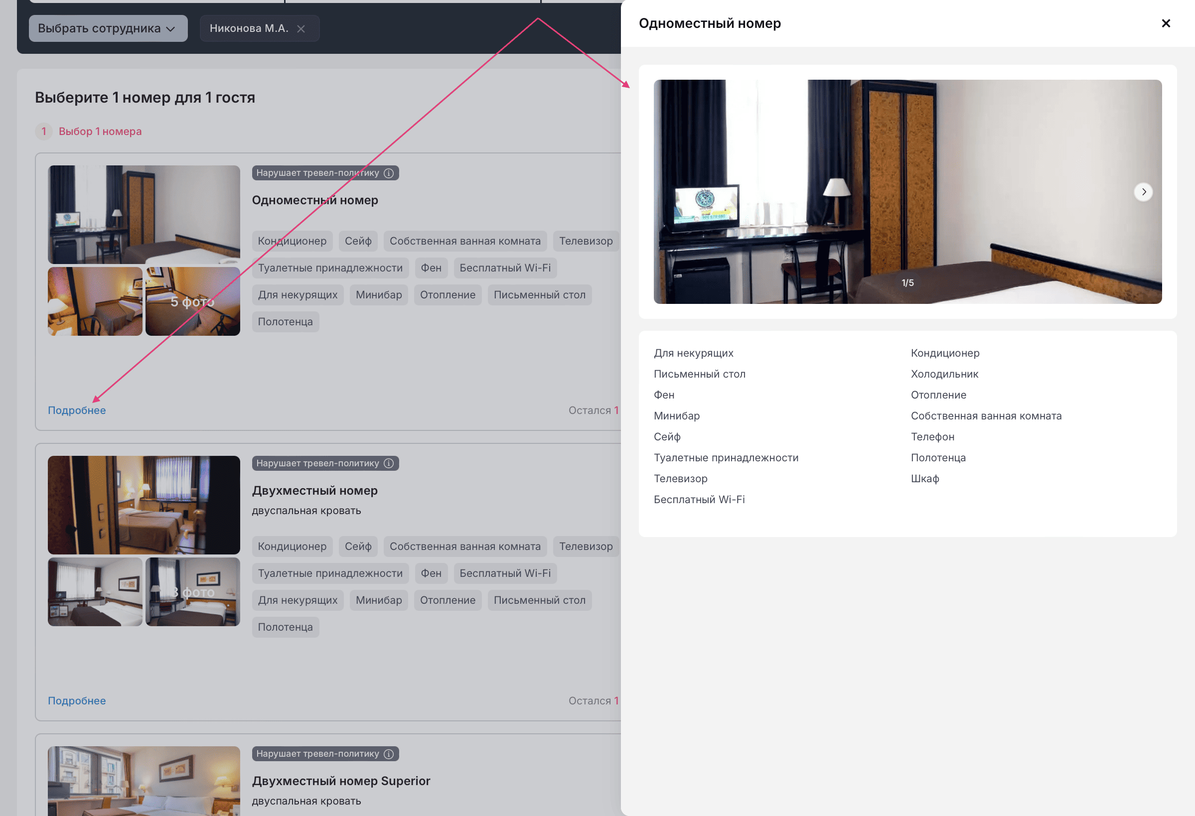 На странице с отелем вы можете ознакомиться с информацией о нем и доступных номерах.