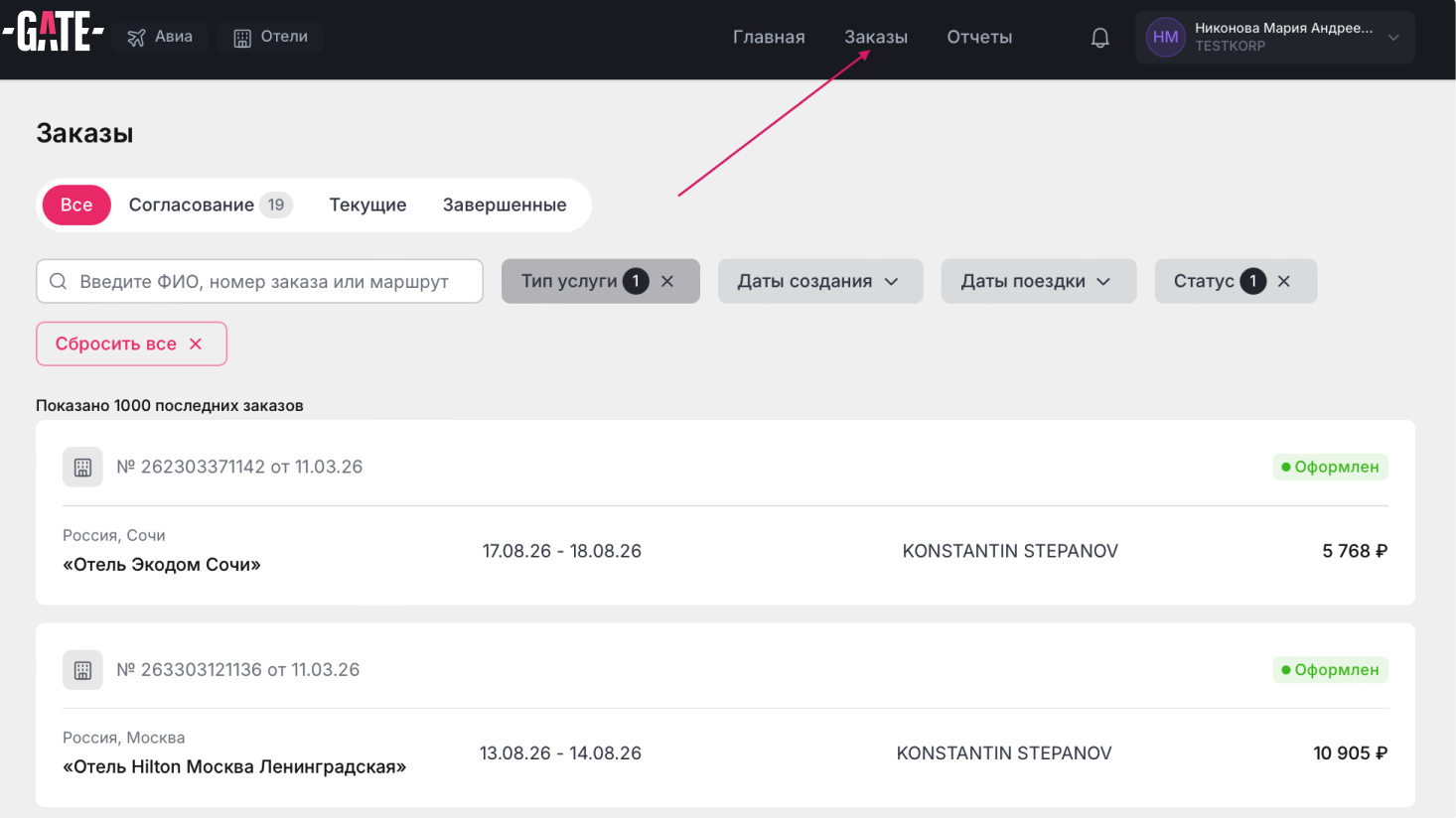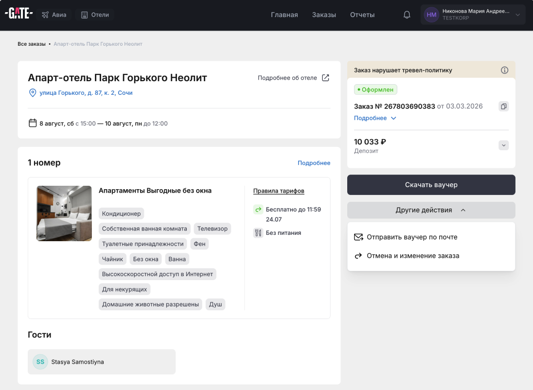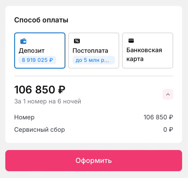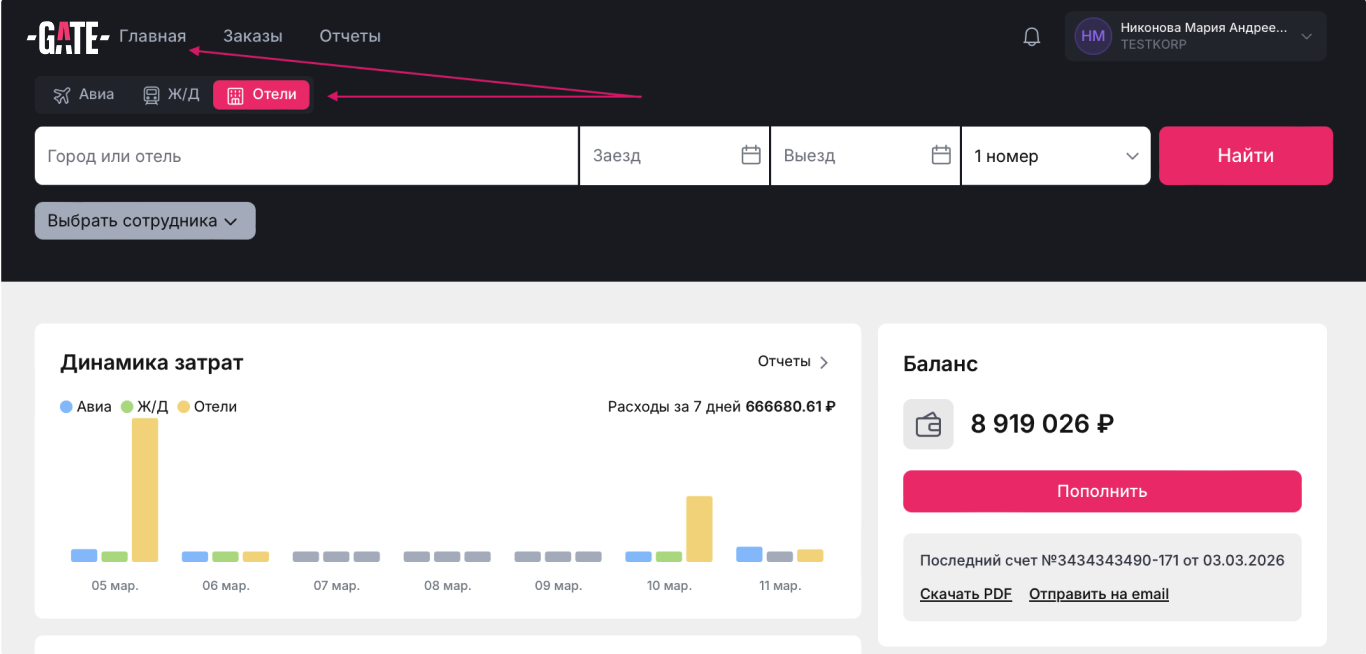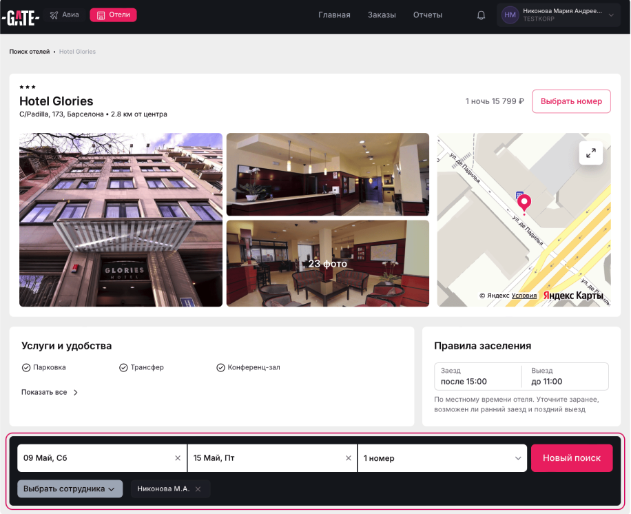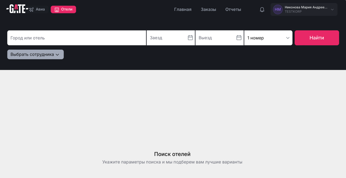 Бронирование отелей доступно не для всех ролей, поэтому если вы не видите в своем личном кабинете поисковый виджет, обратитесь к администратору вашей компании.