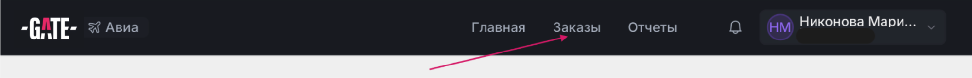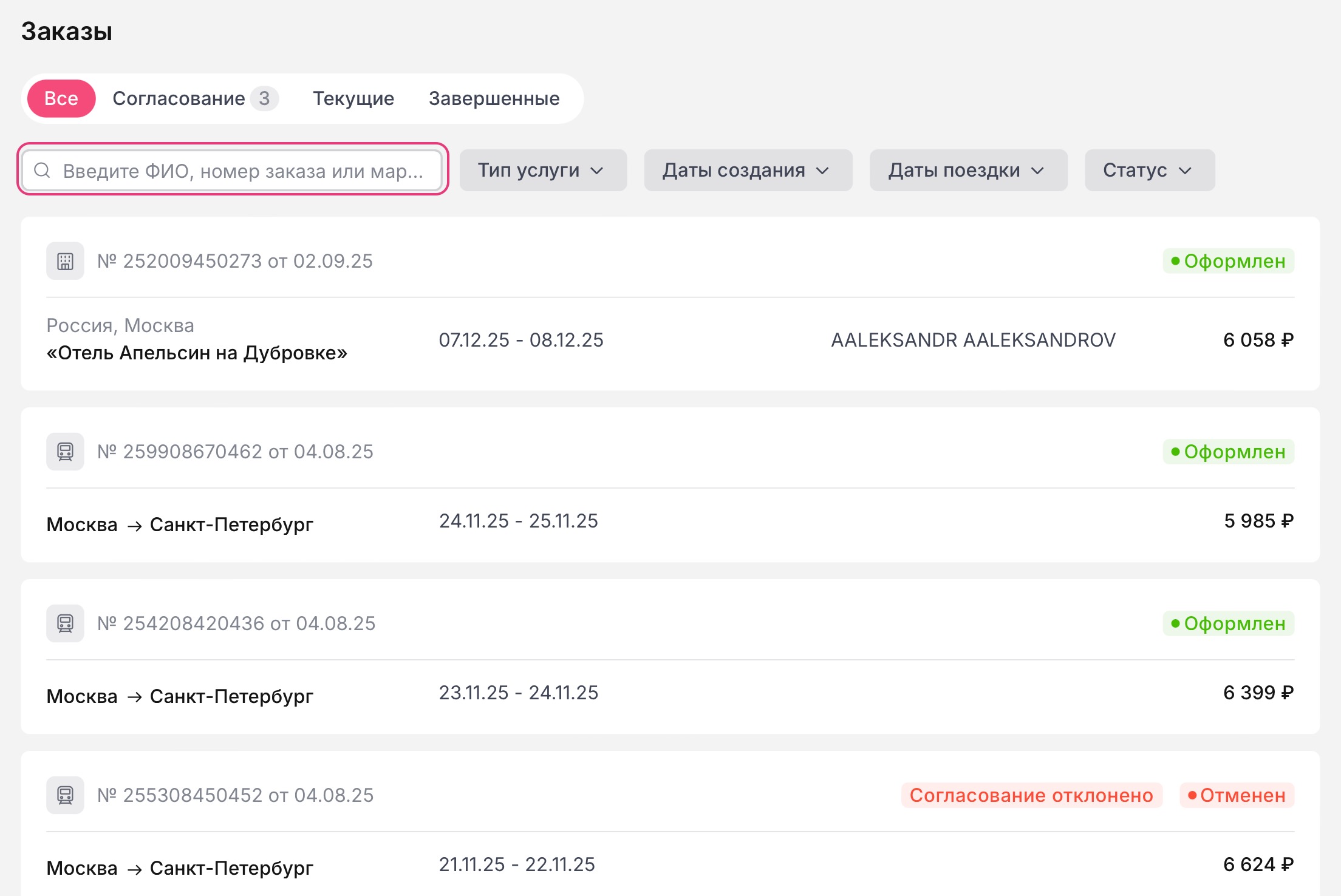 Для поиска нужного заказа перейдите в раздел "Заказы" и введите в поле для поиска: ФИО сотрудника, на которого оформлена услуга, номер заказа или маршрут.