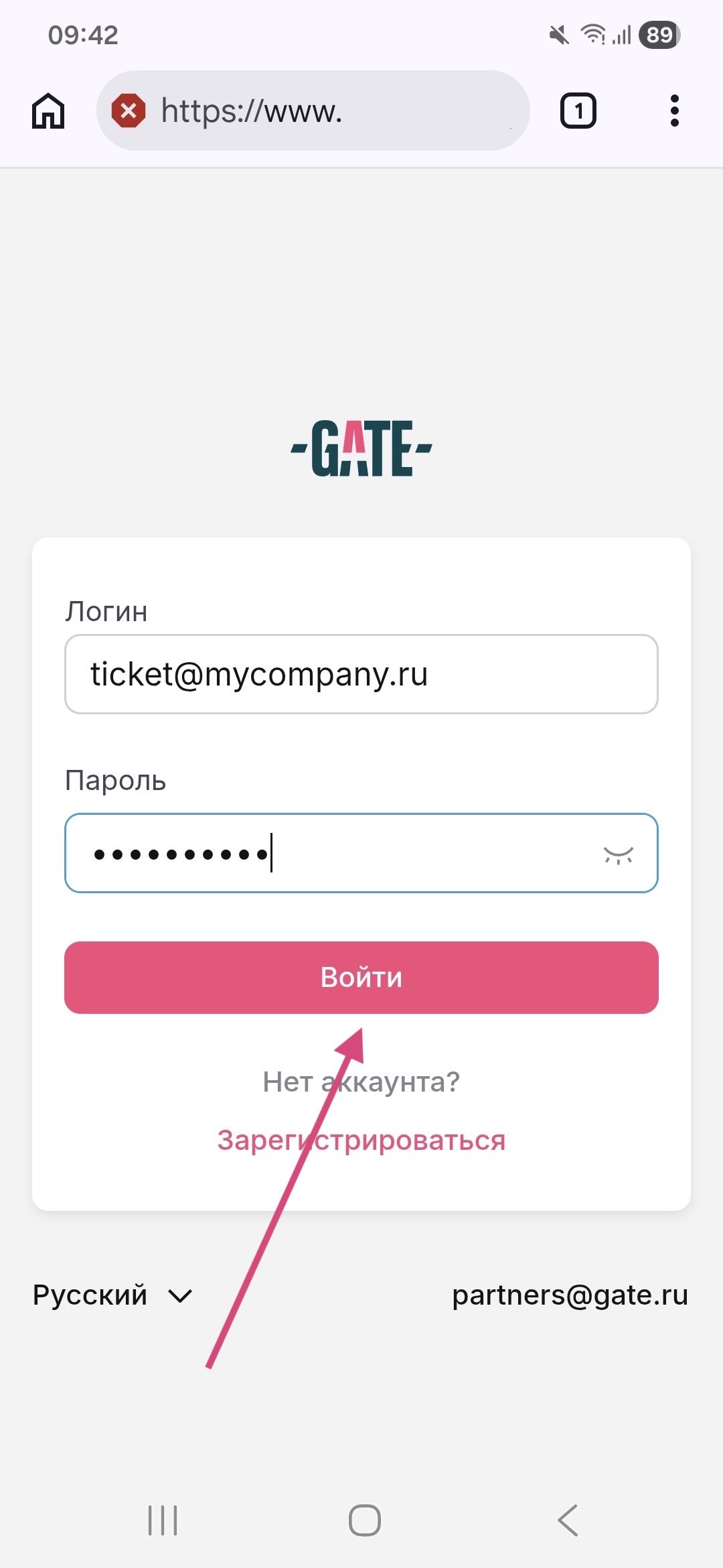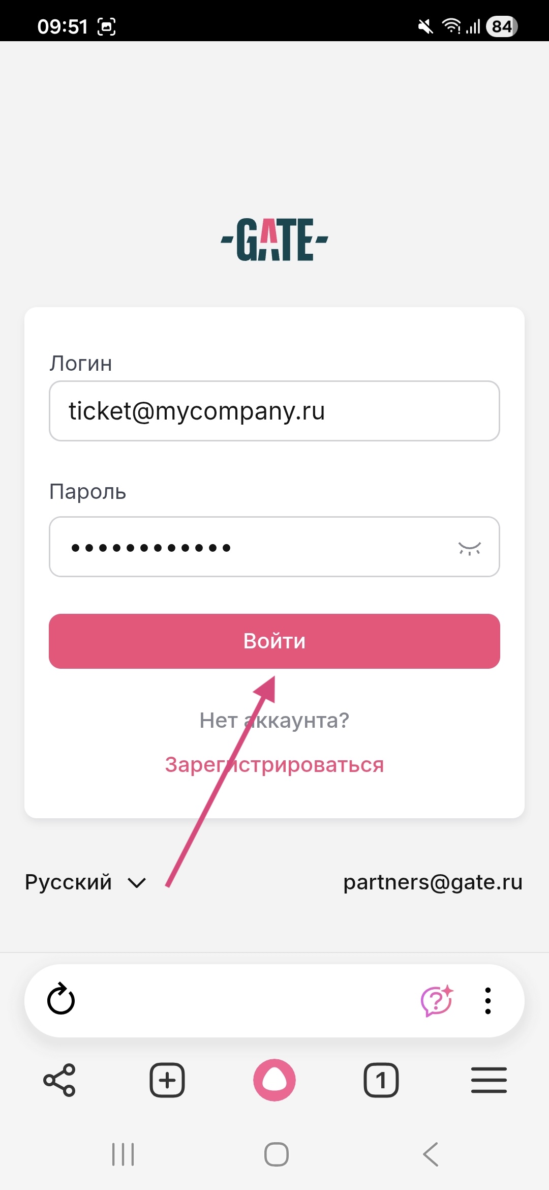 Откройте сайт gate.ru со своего смартфона, коснитесь иконки бокового меню, выберите "Войти в сервис", введите свой логин и пароль, затем нажмите "Войти"