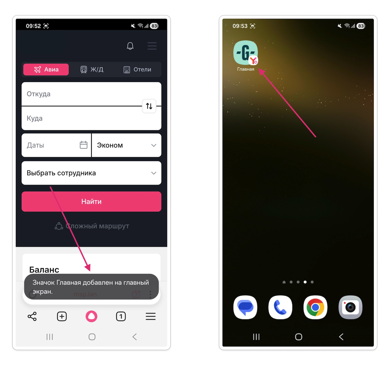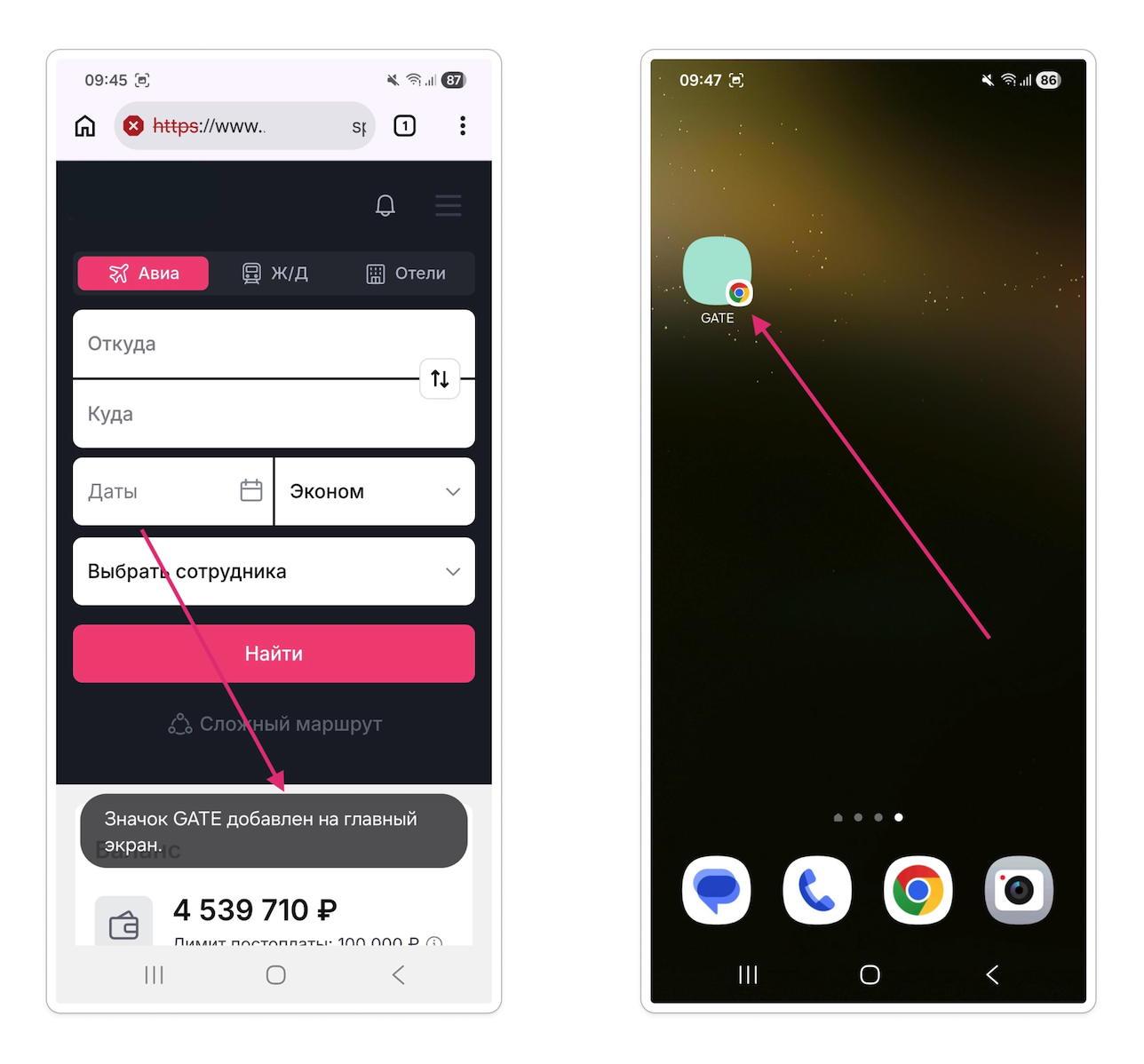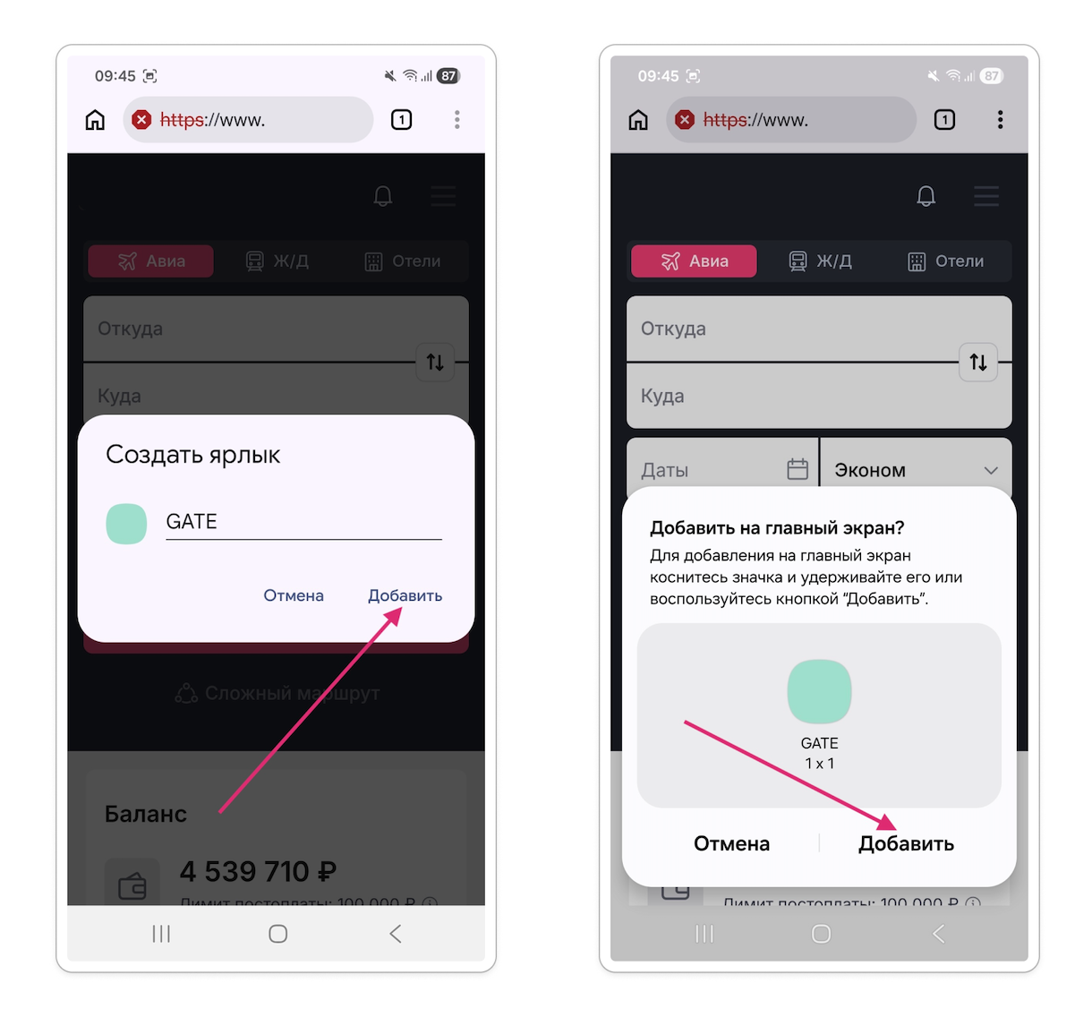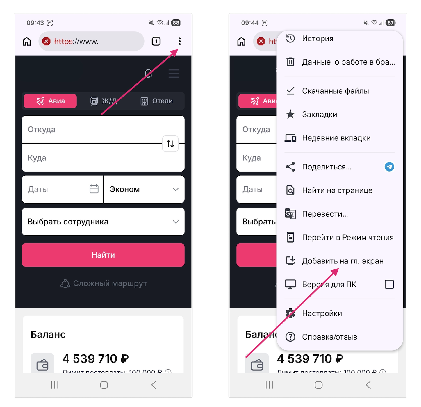 Нажмите иконку с тремя точками расположенную на панели браузера Chrome, в открывшемся меню выберите "Добавить на главный экран"