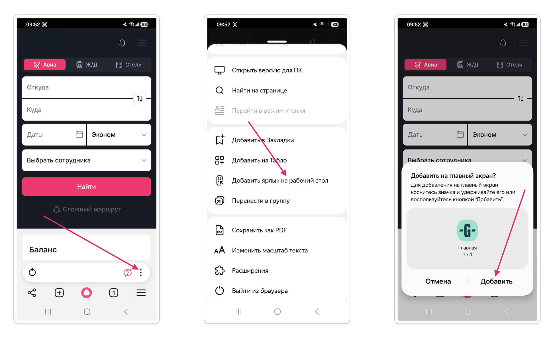 Нажмите на кнопку с тремя точками, расположенную на панели браузера Яндекс, в открывшемся меню выберите "Добавить ярлык на рабочий стол", далее "Добавить"