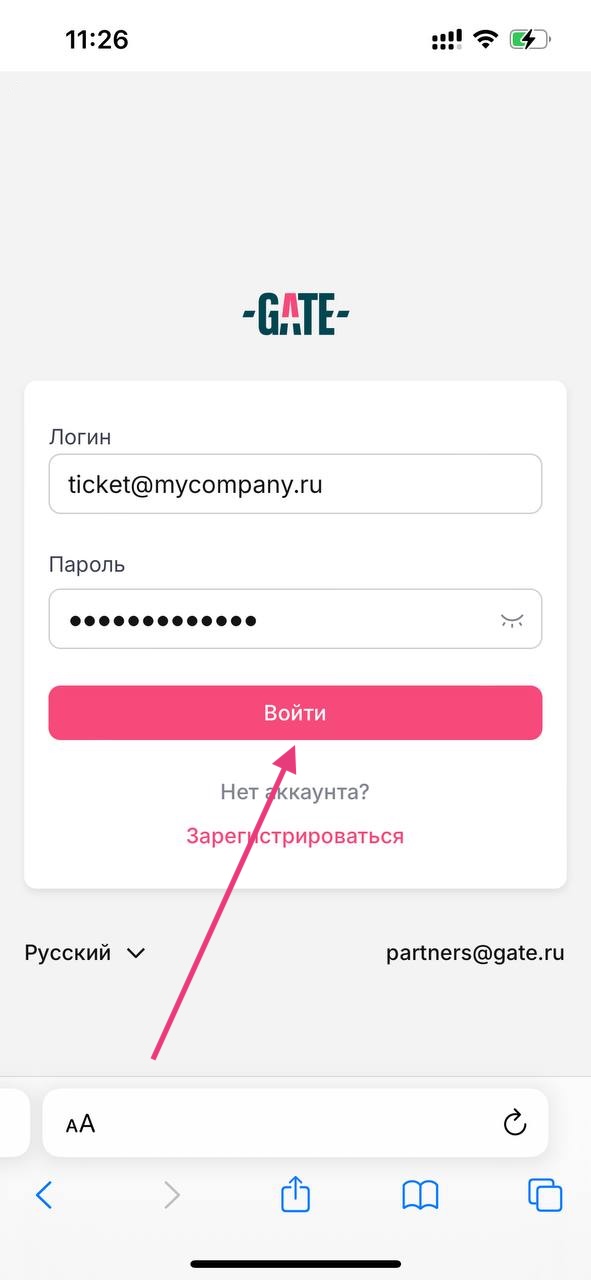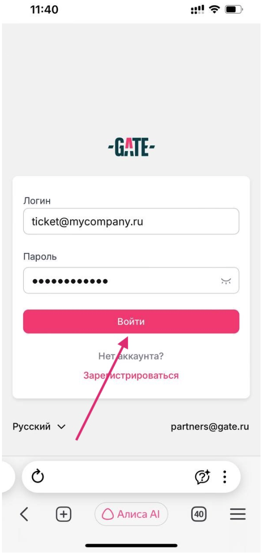 Откройте сайт gate.ru со своего смартфона, коснитесь иконки бокового меню, выберите "Войти", введите логин и пароль, затем нажмите "Войти"