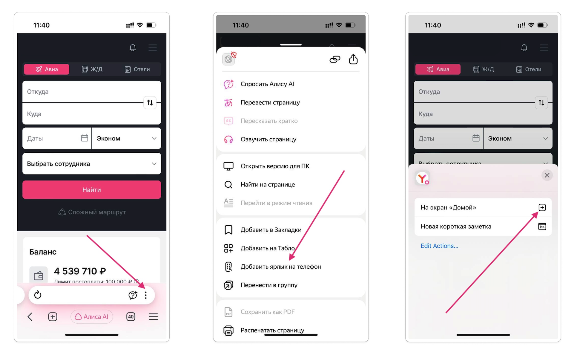 Нажмите на кнопку с тремя точками, расположенную на панели браузера Яндекс, в открывшемся меню выберите "Добавить ярлык на телефон", далее "На экран "Домой""