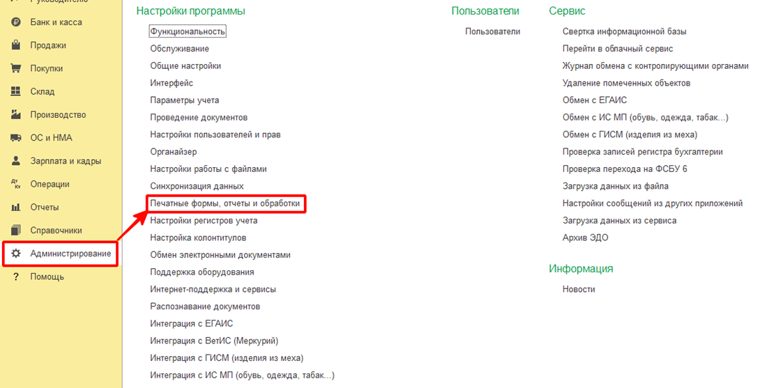 В системе 1С модуль добавляется как дополнительная обработка через раздел "Администрирование" – "Печатные формы, отчеты и обработки".