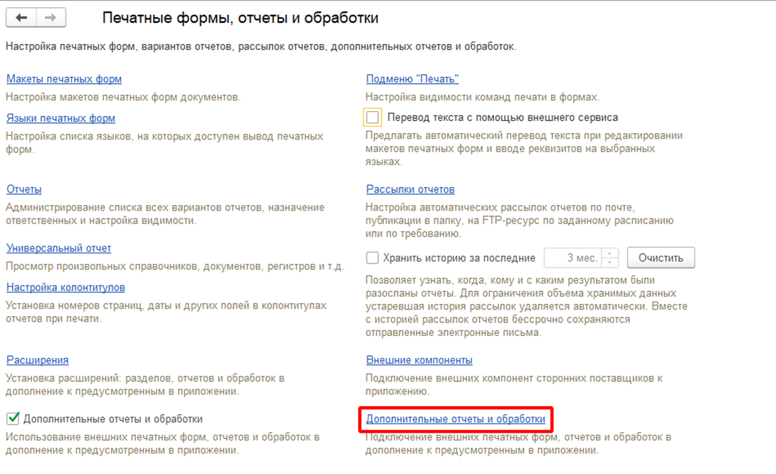 В подменю "Печатные формы, отчеты и обработки" нужно выбрать "Дополнительные отчеты и обработки", если меню неактивно, нужно дополнительно поставить флаг "Дополнительные отчеты и обработки".