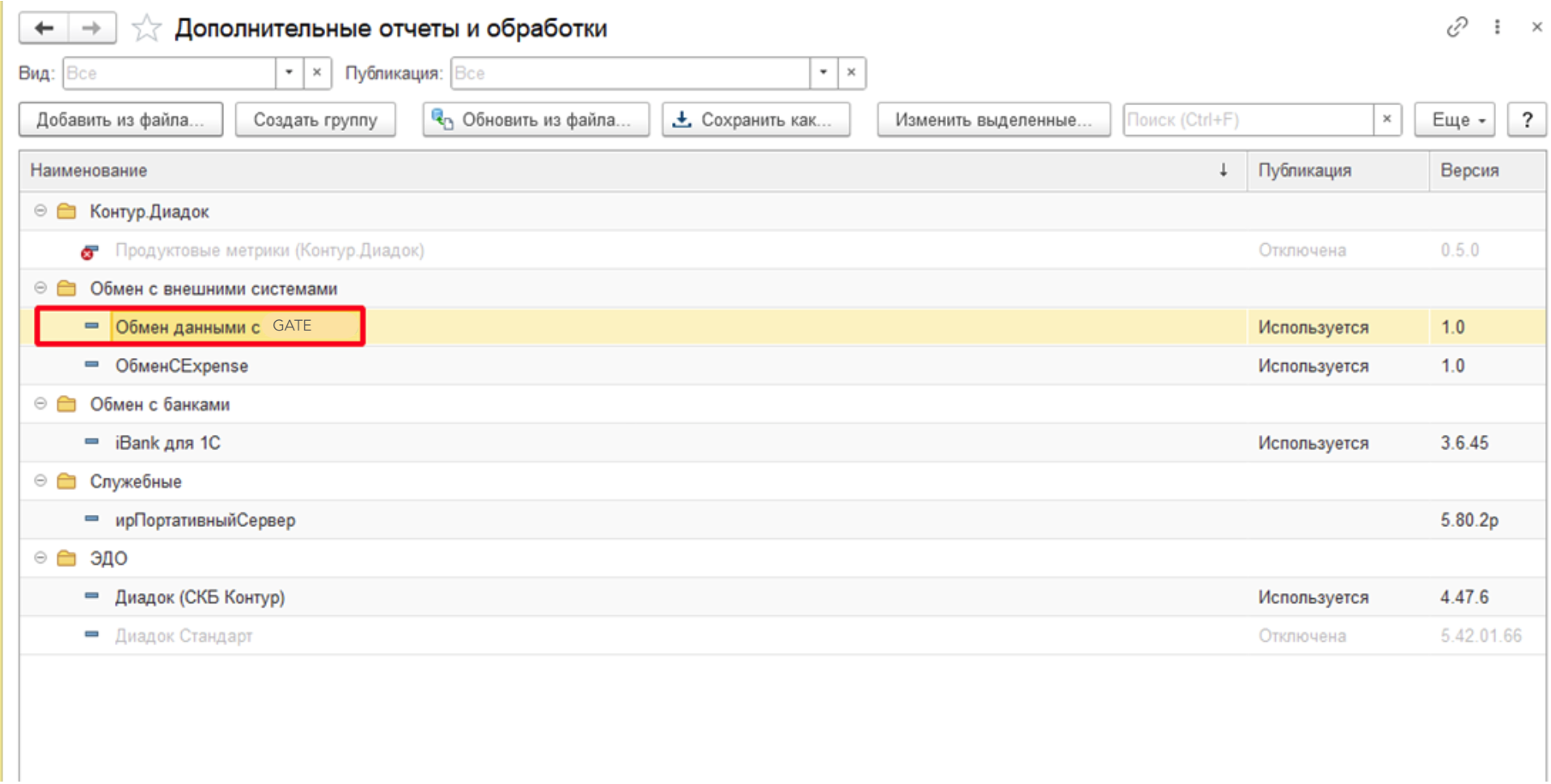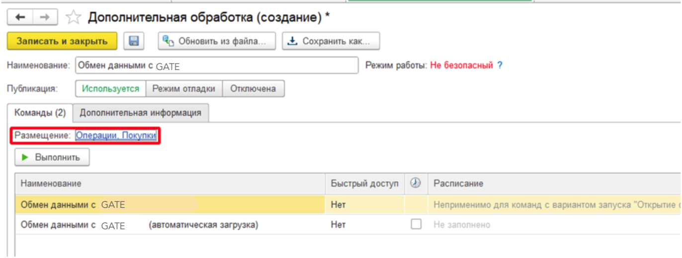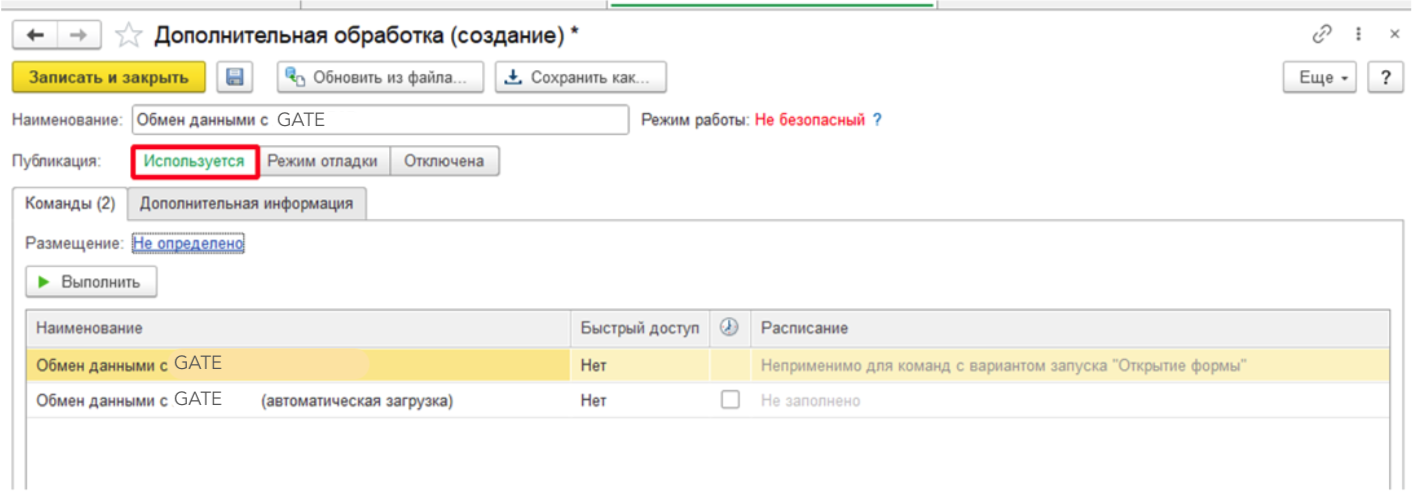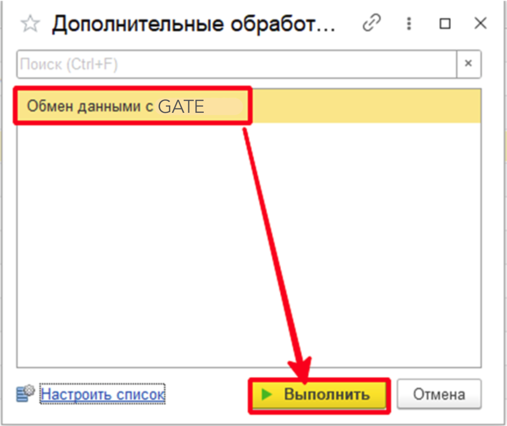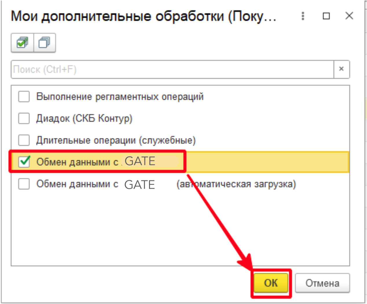 В открывшемся окне нужно установить флаг на обработке "Обмен данными с GATE" и нажать "ОК". После этого обработка появится в списке "Дополнительных обработок".