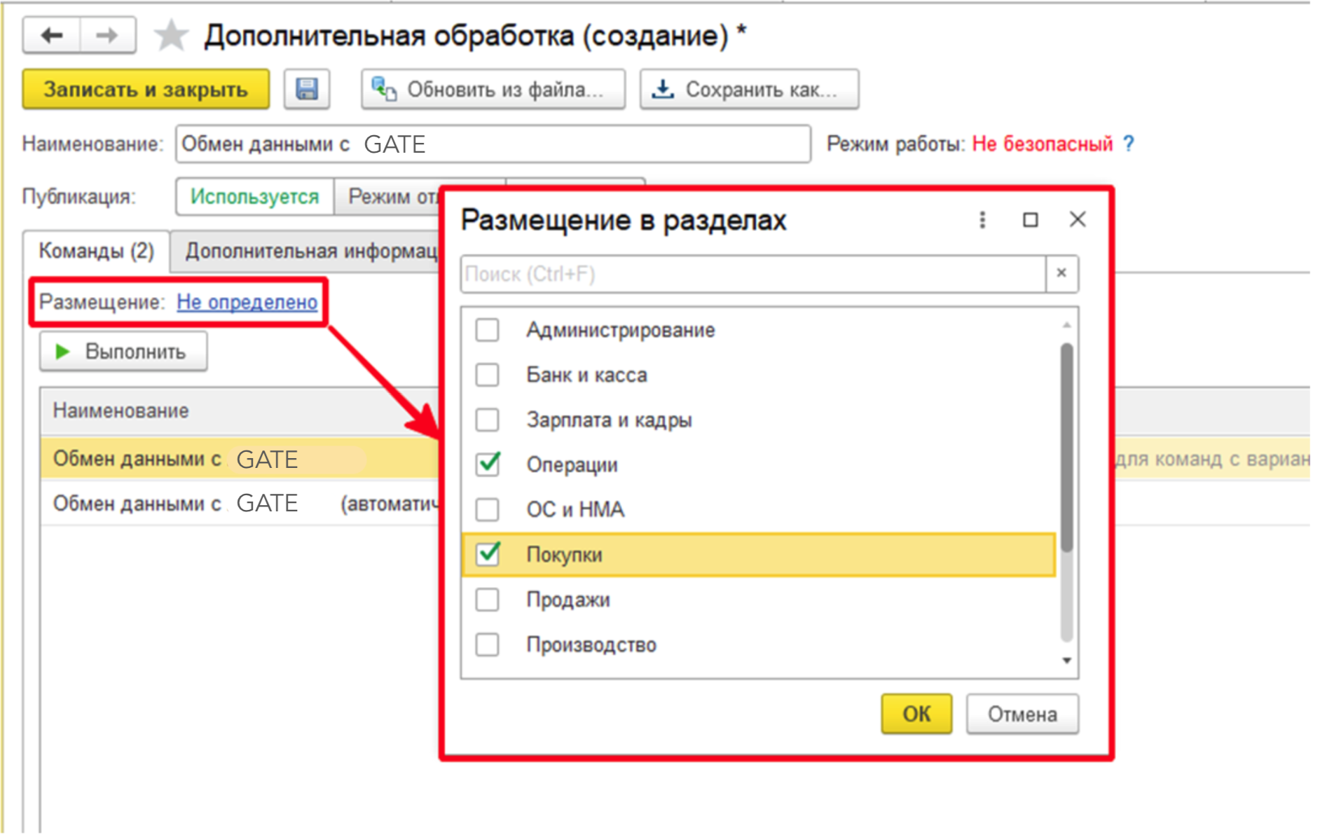 Также необходимо разместить дополнительную обработку в нужном разделе системы. Для этого нужно нажать на синий текст реквизита "Размещение" (По умолчанию обработка никуда не добавлена и в реквизите указано Не определено). Откроется новое окно, где можно выбрать нужные разделы базы.