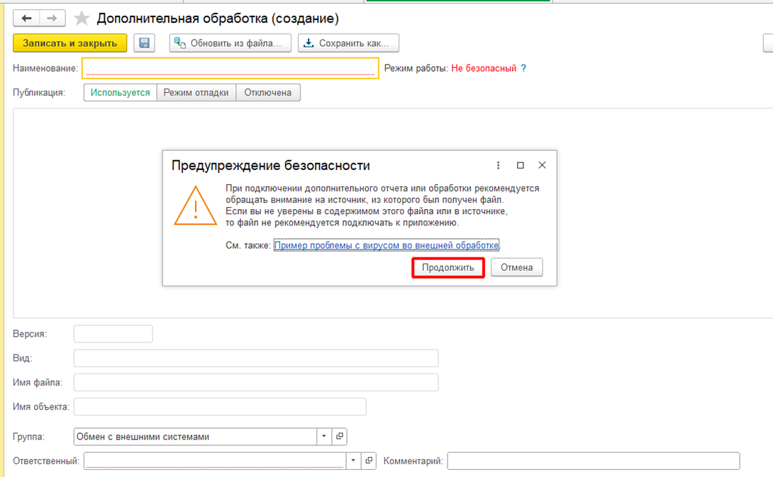 После этого откроется новая форма добавления внешней обработки. Если при открытии появляется окно с предупреждением безопасности нужно нажать "Продолжить".