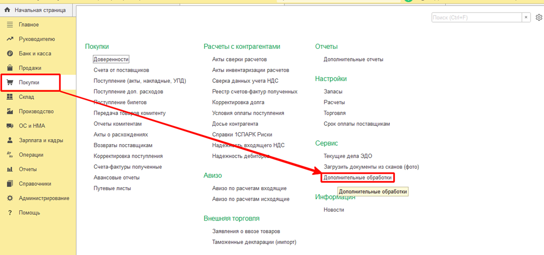 Чтобы зайти в обработку нужно перейти в соответствующий раздел, в текущем примере "Покупки", и нажать "Дополнительные обработки".