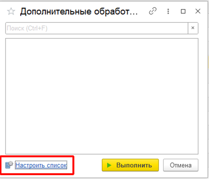 Запуск обработки осуществляется через выбранный раздел – "Дополнительные обработки", если выполнены описанные выше настройки. В окне дополнительных обработок, чтобы зайти в модуль нужно выделить соответствующую строку и нажать "Выполнить" или двойным нажатием левой кнопки мыши по нужной строке.