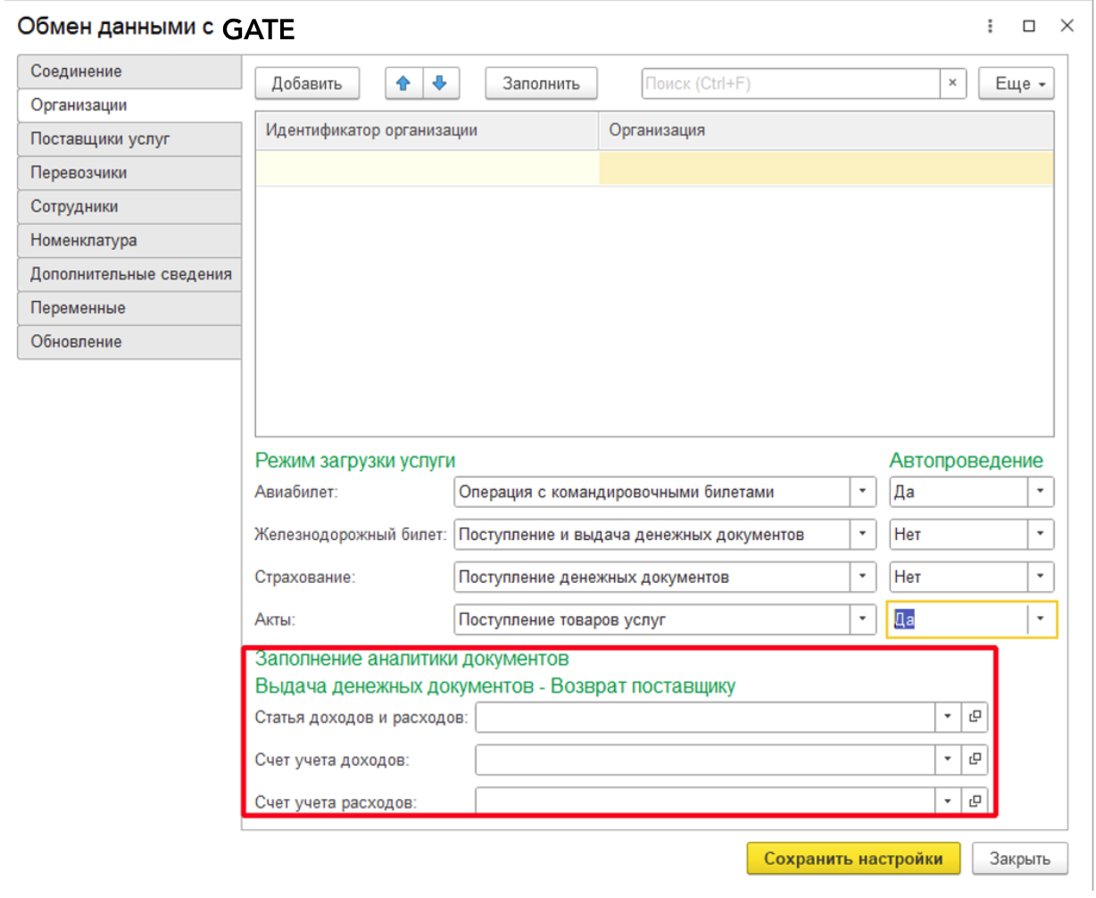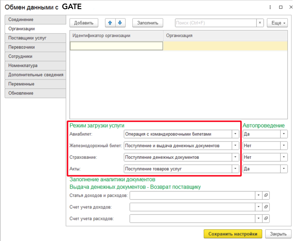 Настройка списка организаций с указанием настройки загрузки услуг по каждой организации. Включает в себя настройки: