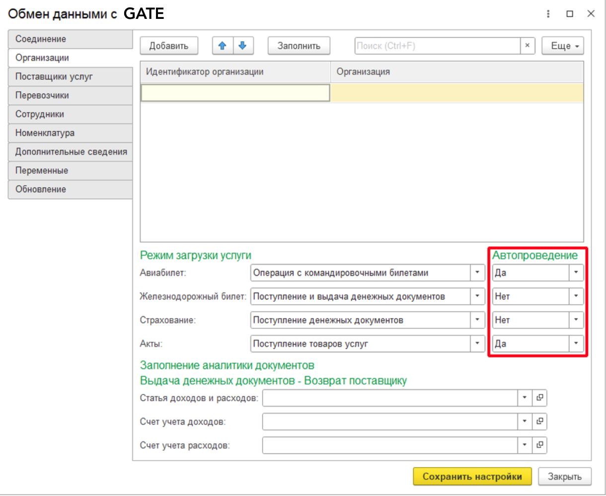 Автопроведение – данный блок позволяет настроить необходимость автоматического проведения документов после их создания обработкой. Доступна отдельная настройка для каждого вида услуг.
