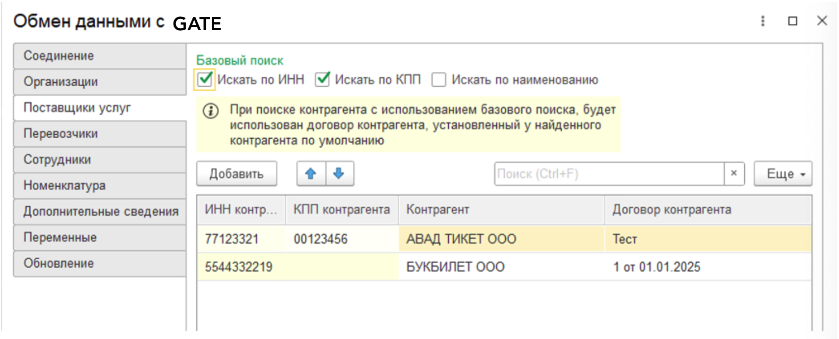 Базовый поиск – настройка базовых параметров для поиска поставщика услуг. Доступны варианты Искать по ИНН, Искать по КПП и Искать по наименованию. Базовый поиск может осуществлятся по нескольким параметрам одновременно, при этом использоваться будет договор контрагента, установленный по умолчанию. Если у контрагента нет договора по умолчанию и в таблице исключений нет полученного сочетания ИНН/КПП, то при загрузке мы получим ошибку заполнения.