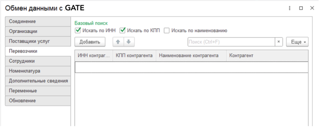 Базовый поиск – настройка базовых параметров для поиска перевозчика. Доступны варианты Искать по ИНН, Искать по КПП и Искать по наименованию. Базовый поиск может осуществляться по нескольким параметрам одновременно.