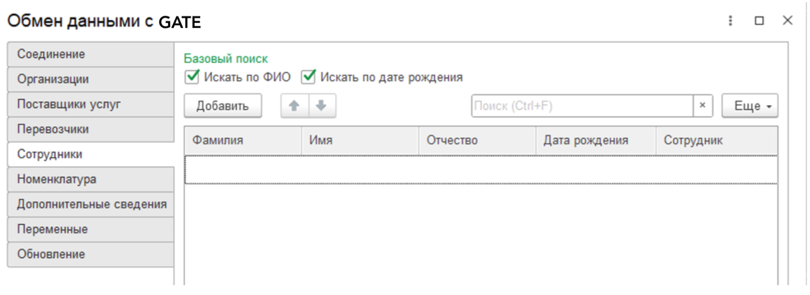 Таблица исключений – настройка, которая позволяет жестко определить по полученным данным (Фамилия, Имя, Отчество и Дата рождения) сотрудника. При загрузке услуг мы получаем Фамилия, Имя, Отчество и Дата рождения и, если эти значения совпадают с указанными в текущей таблице, подставляется сотрудник из таблицы.