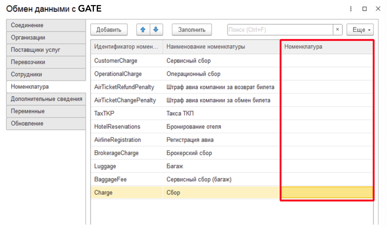Настройка неосновных дополнителдьных услуг. В основном нужна для загрузки Поступлений (акты, накладные, УПД) (гостиницы, сервисный сбор и т.д.). Включает в себя настройки: