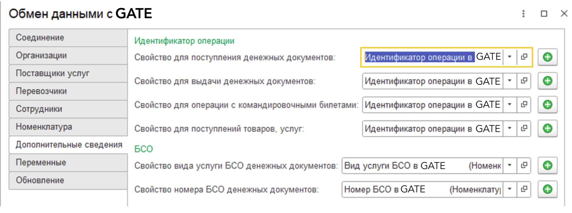 Перевозчик нужен только, если это операция с командировочным билетом. Если БСО, то данную вкладку можно не заполнять. Включает в себя настройки: