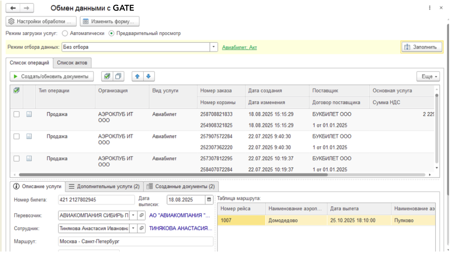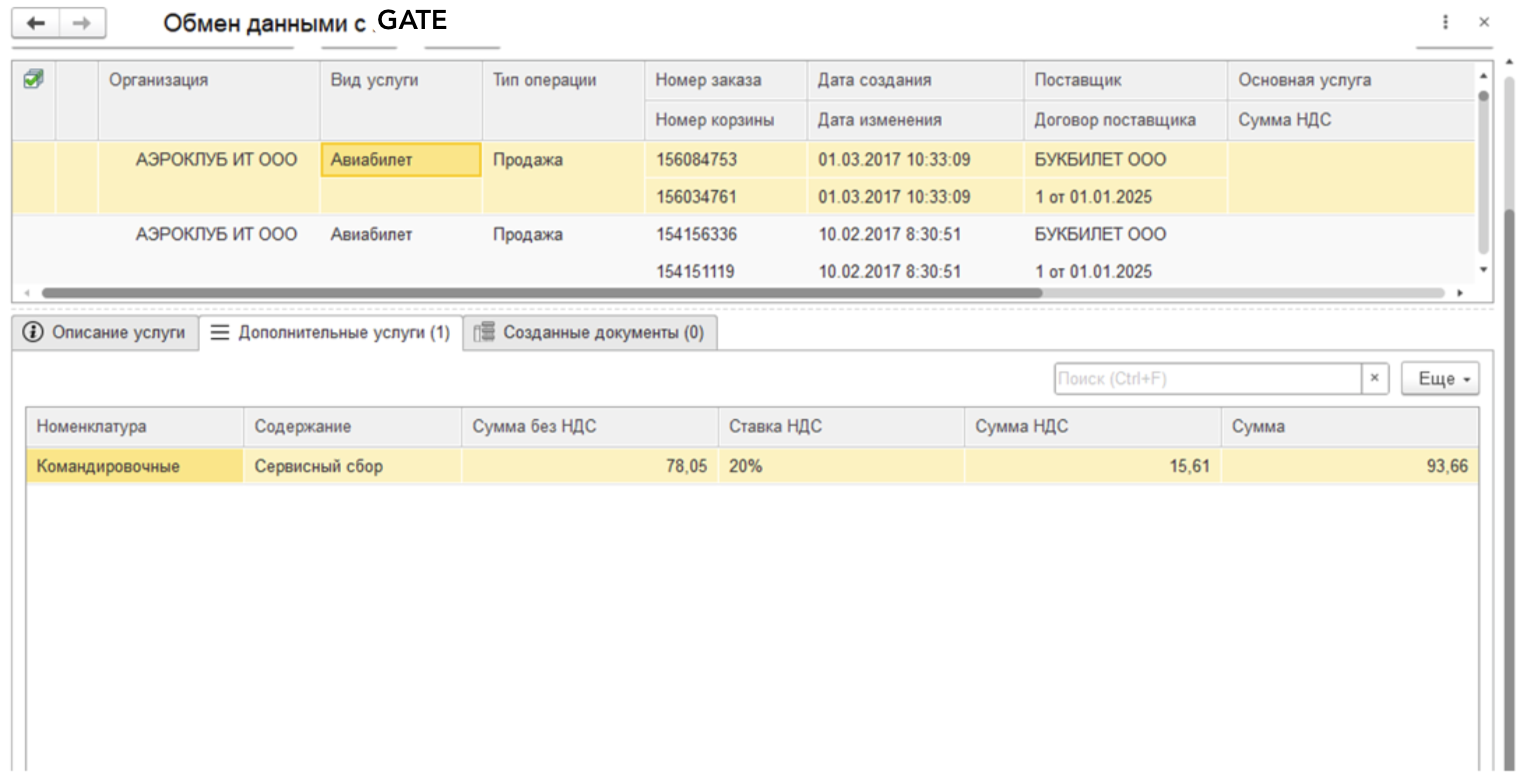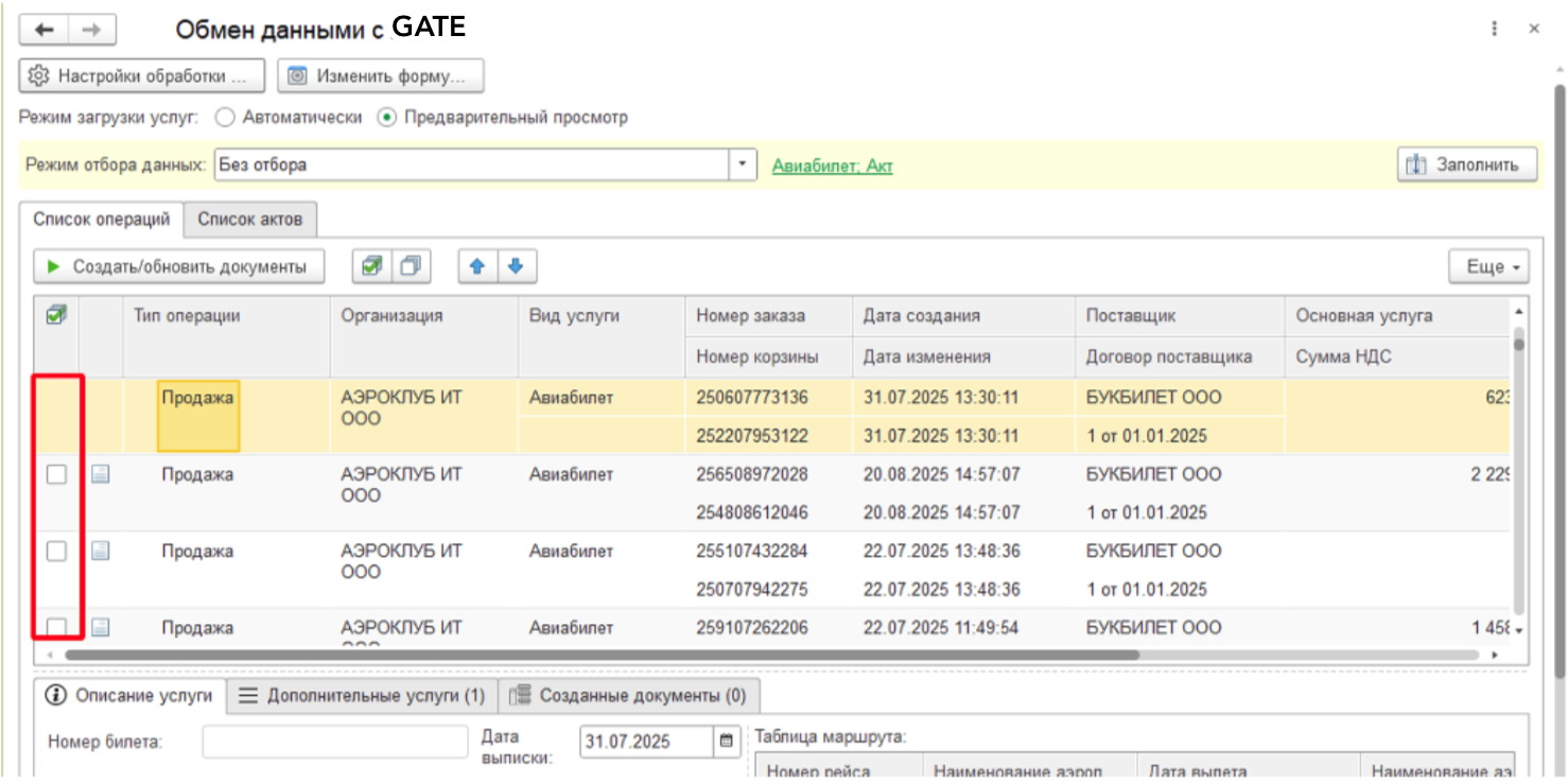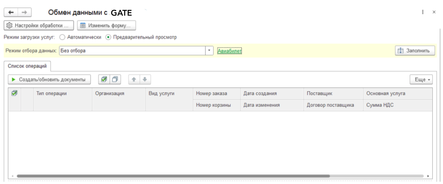 После загрузки табличная часть заполняется билетами, которые располагаются на сайте GATE. В ней можно увидеть Организацию, Вид услуги, Тип операции, Номер заказа, Номер корзины, Дата создания, Дата изменения, Поставщик, Договор поставщика, Основная услуга, Сумма НДС, Сумма, Сотрудник, Режим загрузки данных и Статус загрузки. Самая левая колонка в табличной части это признак загрузки билета, флаг можно проставить только, если мы получили все необходимые данные. Например, если у нас режим загрузки Поступление и выдача денежных документов и нет информации о Сотруднике установить Признак загрузки будет нельзя.