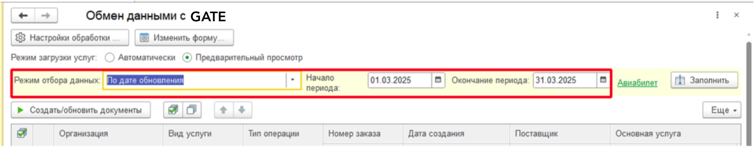 На форме есть настройка Режима отбора данных, которая позволяет выбрать из выпадающего списка вариант отбора. Сейчас доступно 2 варианта отбора Без отбора и По дате обновления. При выборе второго варианта появляются два дополнительных поля Дана начала и Дата окончания.
