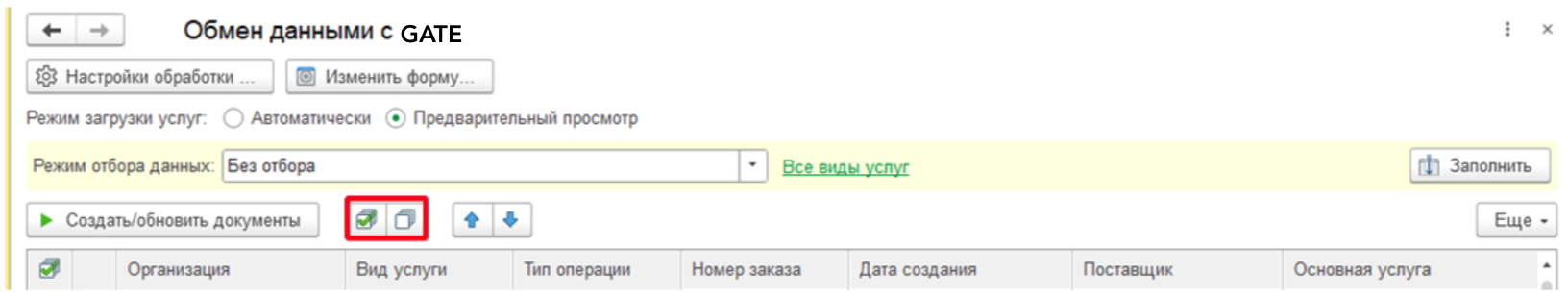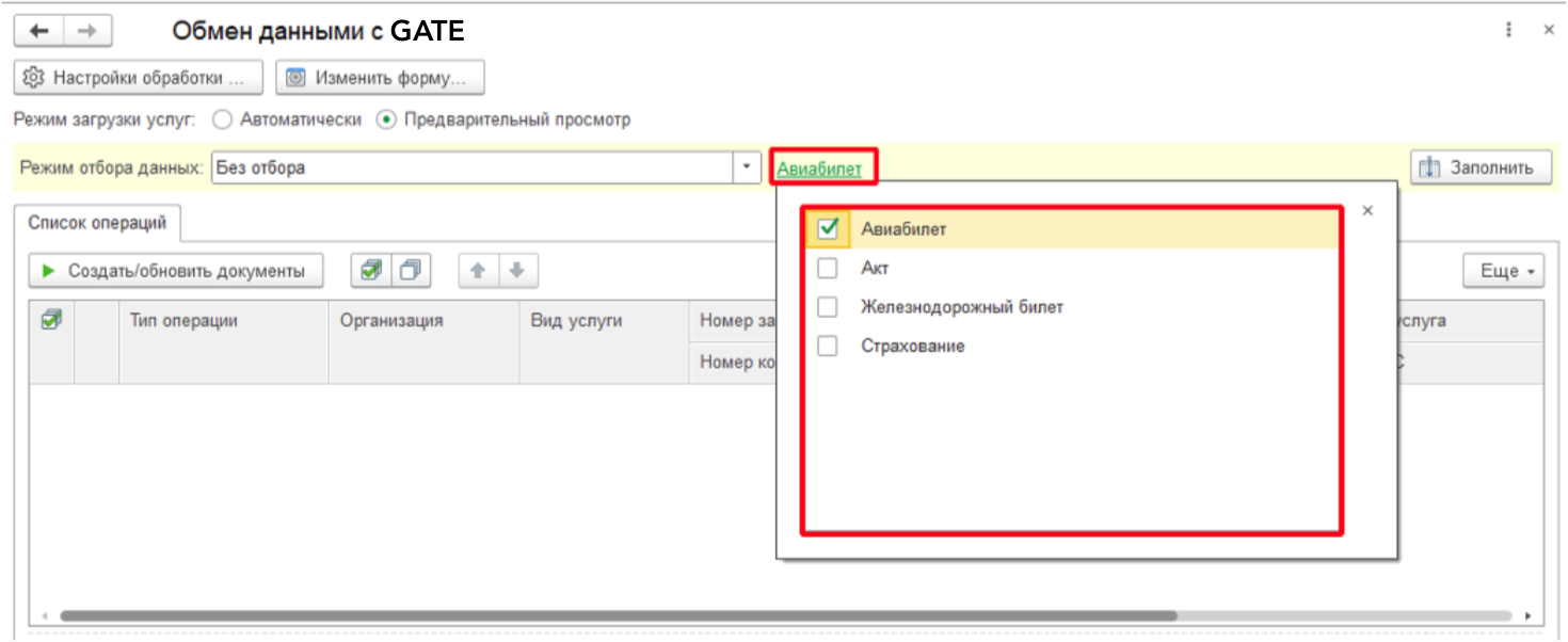 Также можно выбрать какие виды услуг мы будем грузить, можно выбрать несколько вариантов. Если в настройках указано, что какой-либо вид услуг не загружаем, но перед заполнением табличной части мы можем все равно выбрать этот вид услуг в отборе для отображения, но загрузить их без ручного изменения Режима загрузки услуг построчно в самой табличкой части или в Настройках сразу для всех строк будет нельзя.