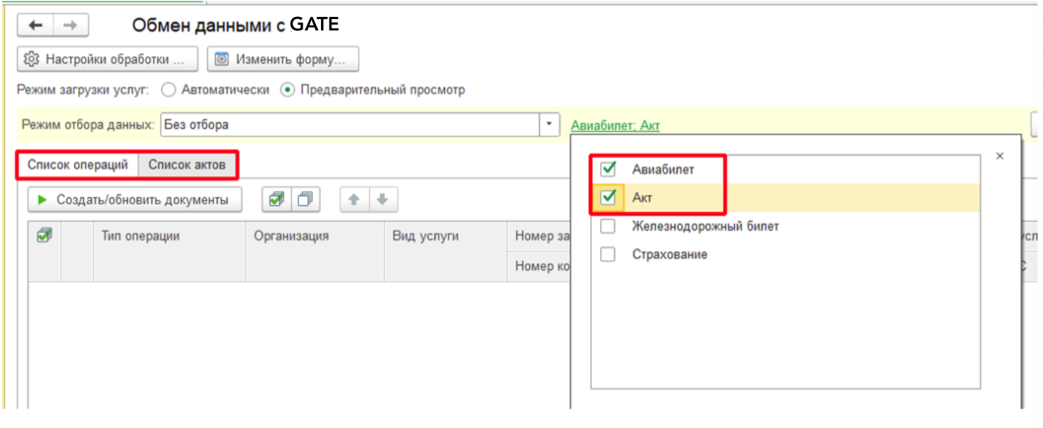 Загрузка услуг бронирования гостиниц, онлайн-регистрации, дополнительных услуг к авиабилетам и сборов осуществляется в Актах.