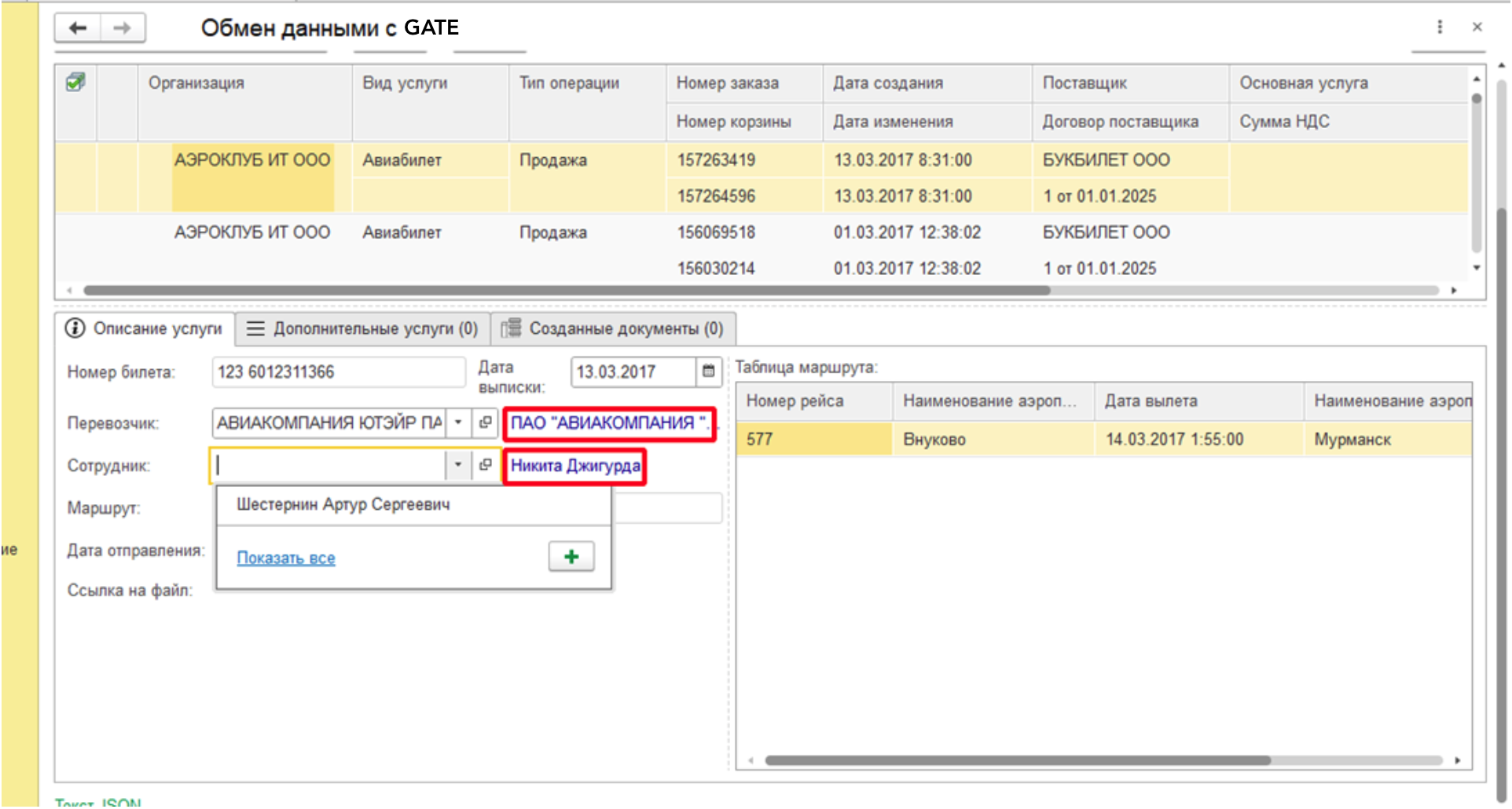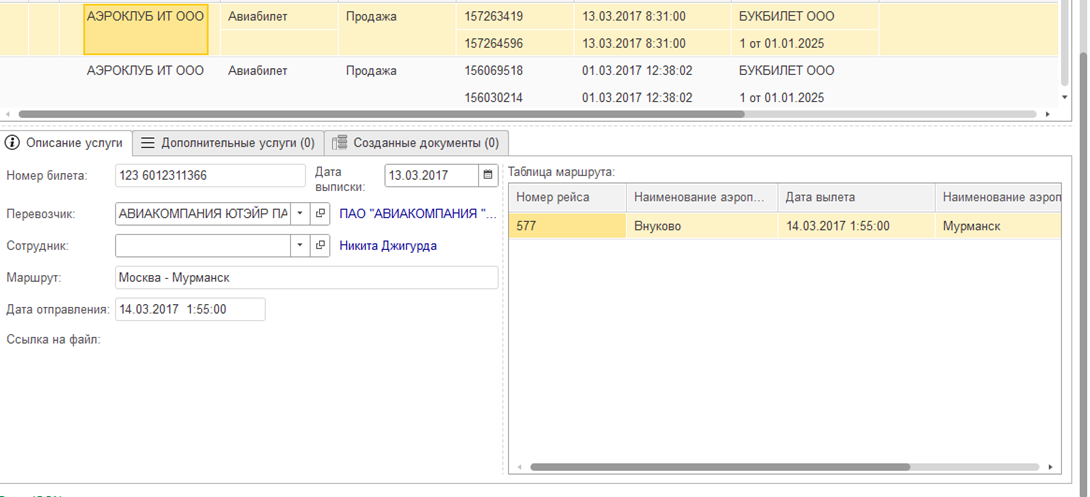 При выделении строки табличной части снизу появляется несколько вкладок: Описание услуги, Дополнительные услуги и Созданные документы. Вкладка Описание услуги содержит в себе краткую информацию, которая относится к данной услуге, а именно: Номер билета, Дата выписки, Перевозчик, Сотрудник, Маршрут, Таблица маршрута (в ней информация о всех перелетах с датами), Дата отправления и Ссылка на файл.