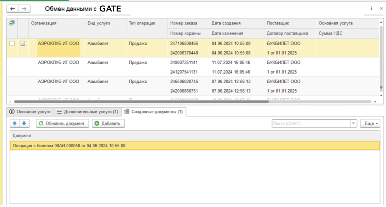 Вкладка Созданные документы список созданных документов в базе 1С по билету.