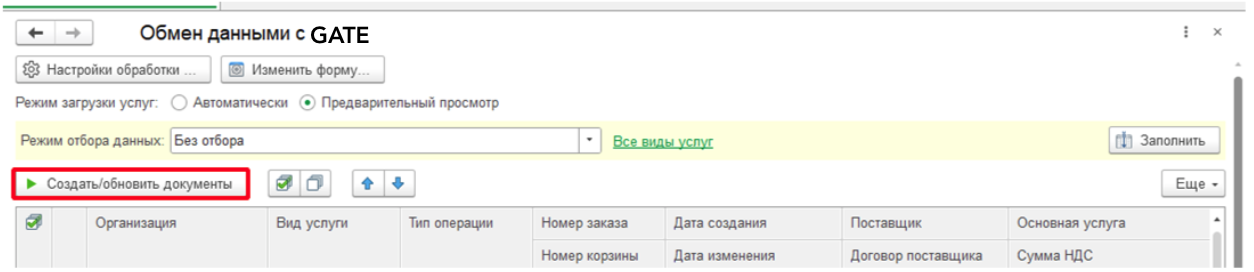 Создание и обновление документов происходит по кнопке Создать/обновить документы, при нажатии на которую будут создавать или обновляться документы в базе 1С по билетам, у которых установлен признак загрузки в табличной части. Документы создаются непроведенными.
